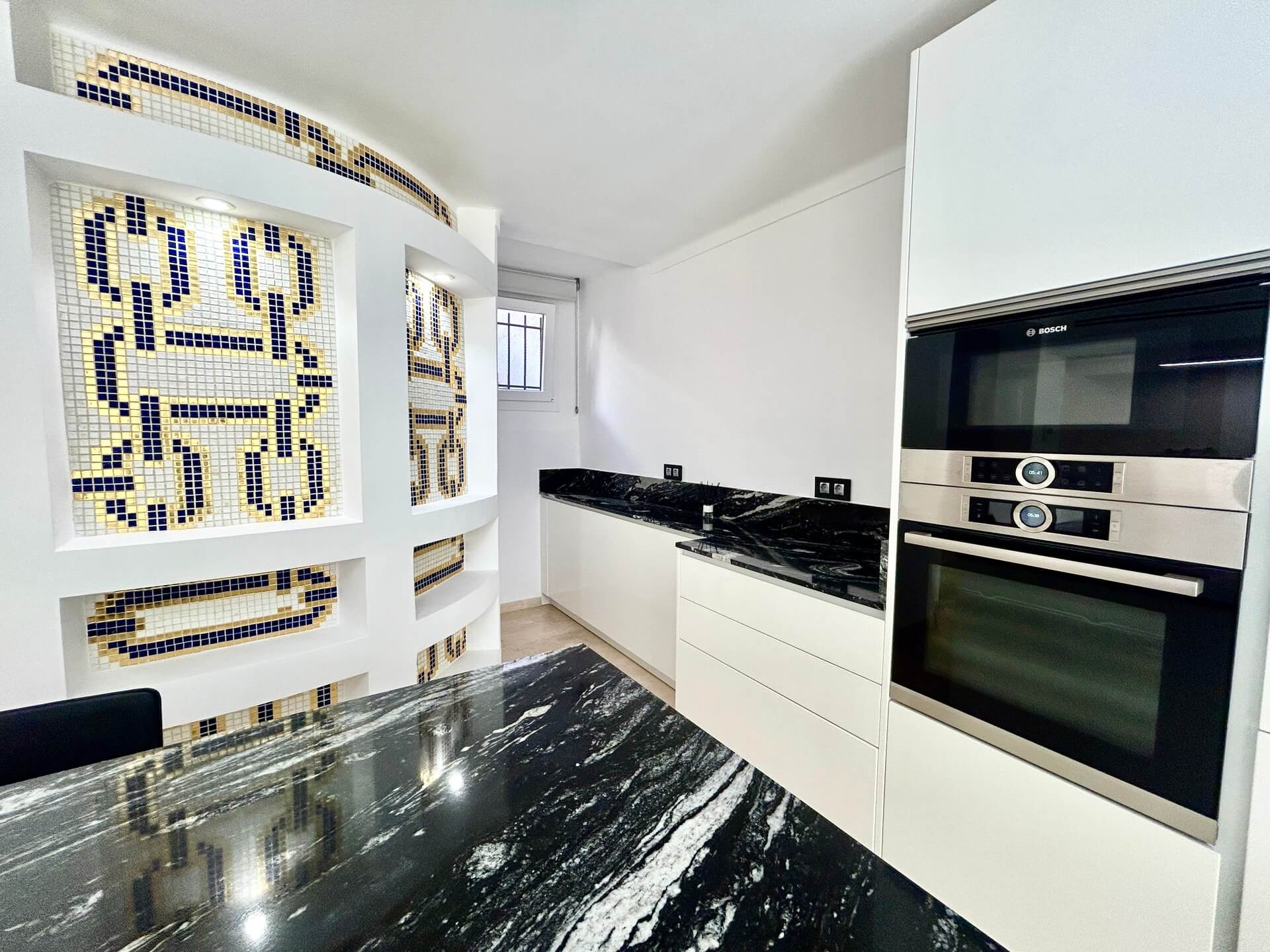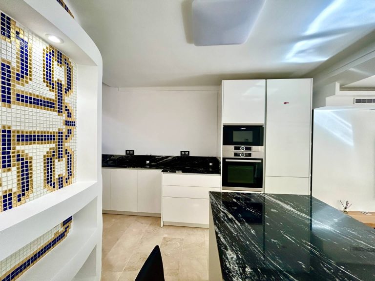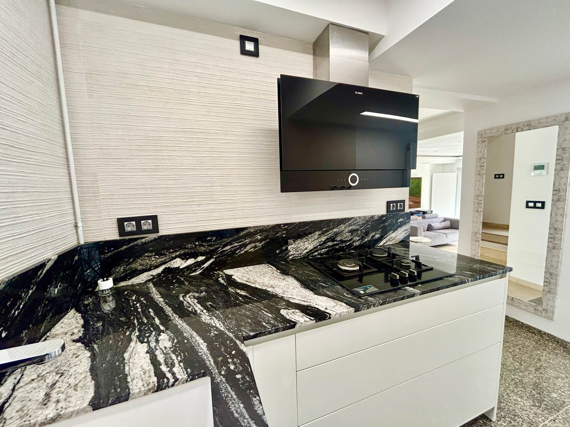 Die moderne Küche präsentiert sich mit einer edlen Kücheninsel, die ein markantes Zentrum bildet. Ausgestattet ist sie mit einem Sichtbackofen und Mikrowelle auf der einen Seite sowie einem Gasherd und einer Geschirrspülmaschine auf der anderen, um höchste Funktionalität und Stil zu bieten.
