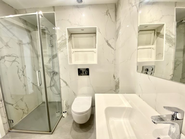 Die drei Schlafzimmer befinden sich in einem separaten Bereich im hinteren Teil der Wohnung und können durch eine Tür abgetrennt werden. Das Hauptschlafzimmer verfügt über ein eigenes Badezimmer en suite, während die anderen beiden Schlafzimmer vielfältig genutzt werden können, sei es als Büro oder Ankleideraum.