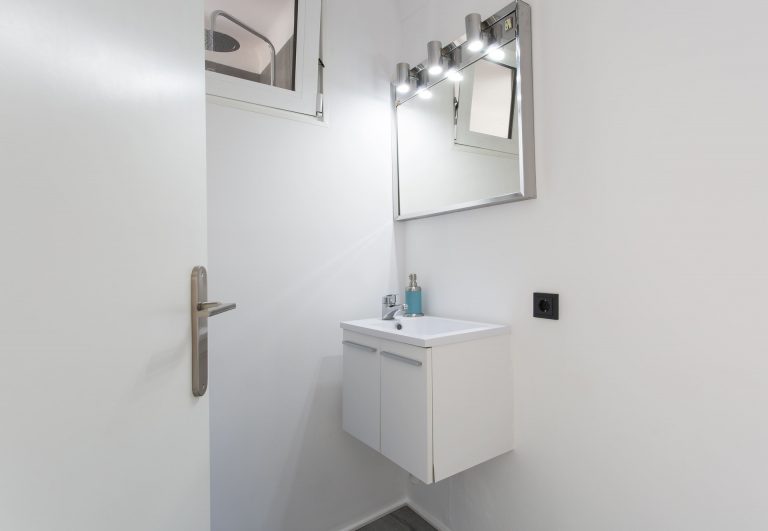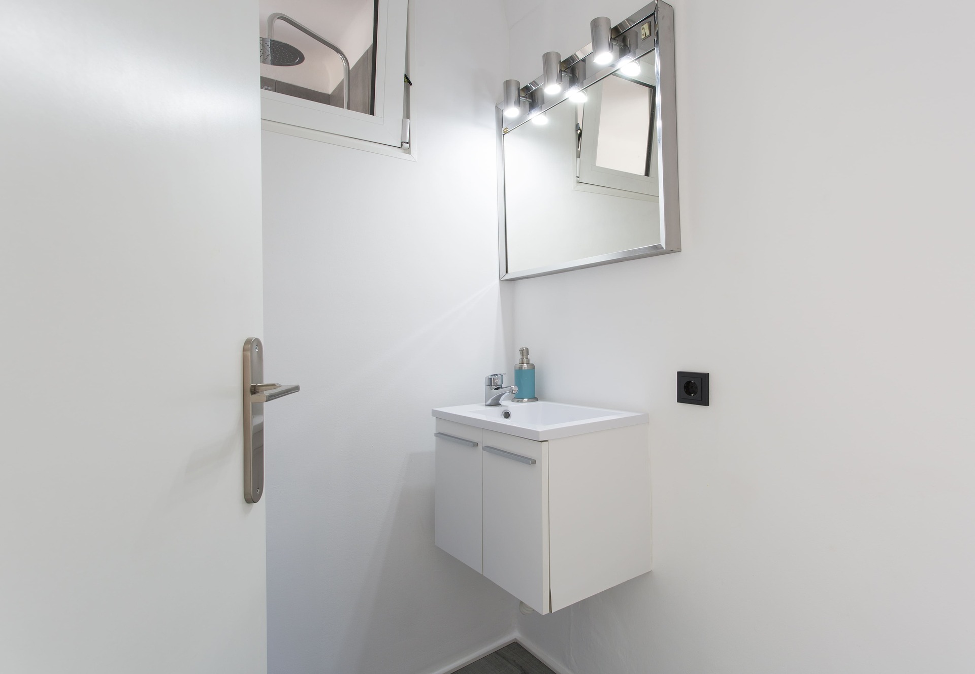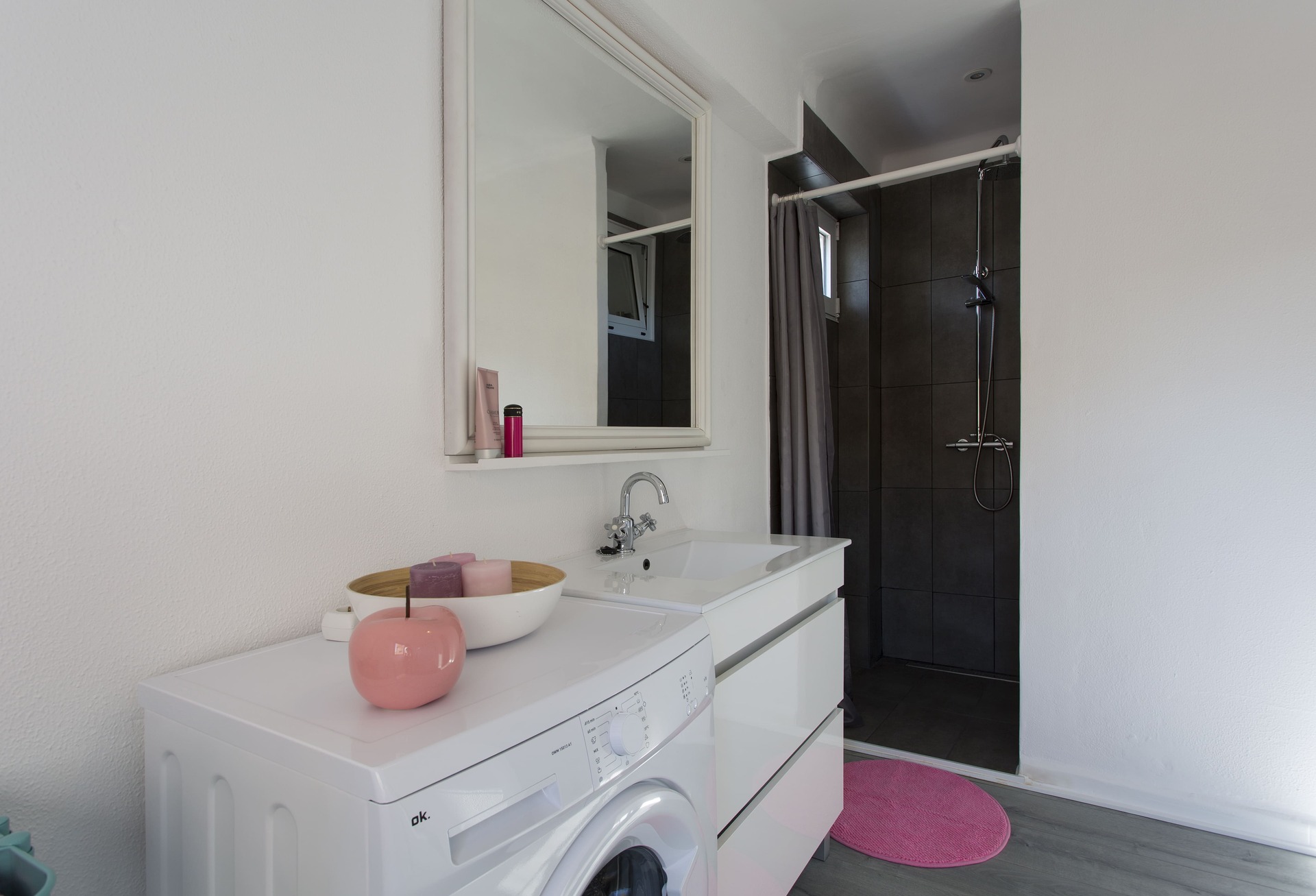 Die Immobilie umfasst ein Schlafzimmer und ein Badezimmer mit einer Duschkabine, von der aus man einen direkten Blick auf das Meer genießen kann. Die offen gestaltete Küche ist mit hochwertigen Geräten ausgestattet und führt in den ansprechenden Wohn- und Essbereich. Das Wohnzimmer verfügt über ein Bettsofa, das sich leicht in ein Doppelbett für Besucher umwandeln lässt.