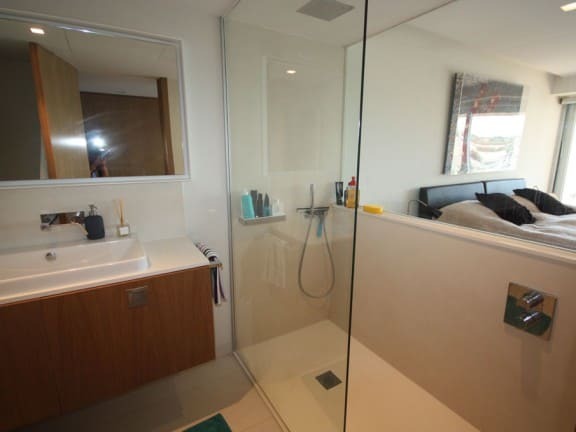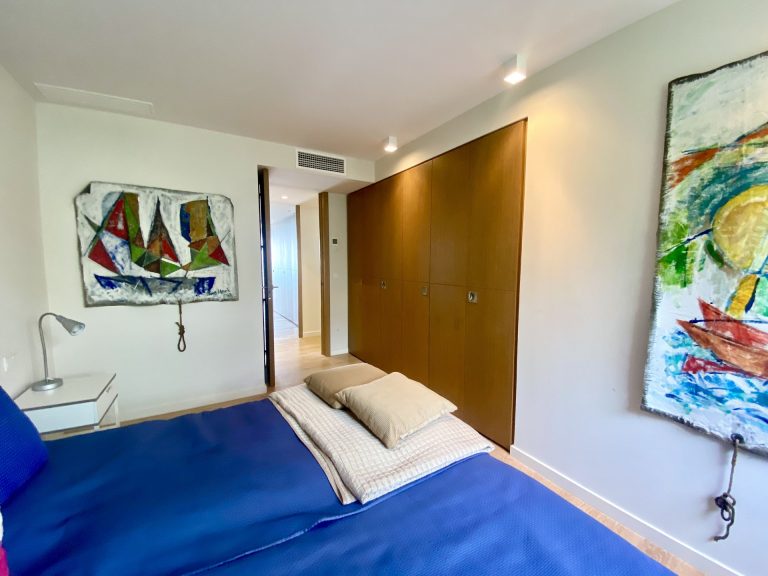Zur Wohnung gehören zwei komfortable Schlafzimmer und zwei Badezimmer, von denen eines en suite ist und direkten Zugang zu einer Terrasse mit Meerblick bietet.